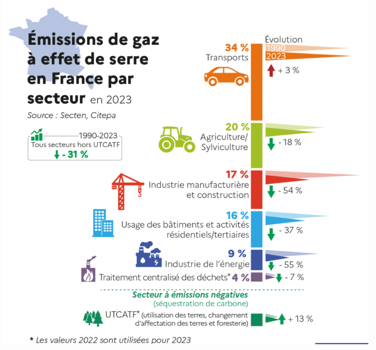 Cette infographie des émissions de GES par secteur illustre ce paradoxe avec de très fortes baisses enregistrées depuis 1990, sauf pour le seul secteur des transports. La liste des innovations ou des contraintes appliquées aux transports est pourtant longue : électrification du parc de véhicule, développement des modes actifs, du covoiturage et des transports en communs, ZFE-m …