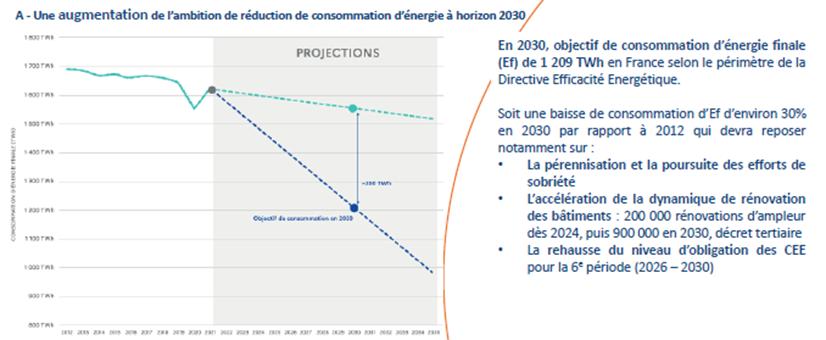 En 2023, la consommation d’énergie finale relevant du périmètre de la Directive Efficacité Énergétique (DEE) atteignait 1 510 TWh. Pour respecter l’objectif fixé par la (DEE) – soit 1 243 TWh en 2030 – une baisse annuelle d’environ 38 TWh devra être réalisée sur la période 2024‑2030.